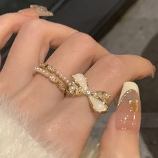 여성 진주 리본 더블 레이어드 오픈 링 반지 2종 세트 A1422