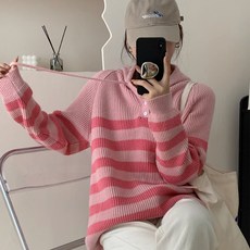 주디앤 여성 코지 후드 버튼 스트라이프 니트