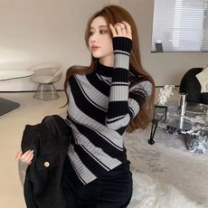 ROYALBELLE 여성 스트라이프 니트 스웨터 슬림핏 긴팔 티셔츠 반하이넥 풀오버 스웨터 이너웨어 D0111609