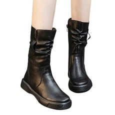 도오빠 후크앙 여성 소가죽 미들 부츠 키높이 3.5CM 통굽 앵클부츠 주름 사이드지퍼 블랙 여자부츠 발편한 가을