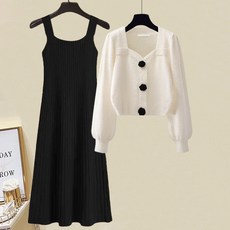 해피유통 여성 투프스 상하세트 플라워 버튼 브이넥 아우터 상의 민소매 니트 원피스