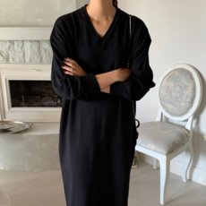[아롬블룸] V넥 배색 니트 롱 원피스