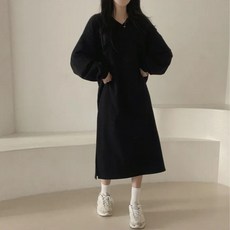 닷츠스타일 긴팔 카라넥 루즈핏 기모 롱 원피스