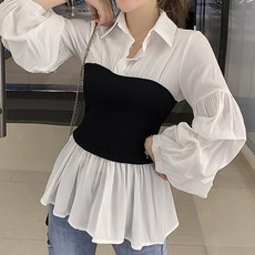 디어로우 브리엘 셔링 플레어 배색 블라우스