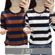 ROYALBELLE 2장묶음 여성 캐주얼 라운드넥 티셔츠 스트라이프 긴팔티 기본티셔츠 춘추용 V12110